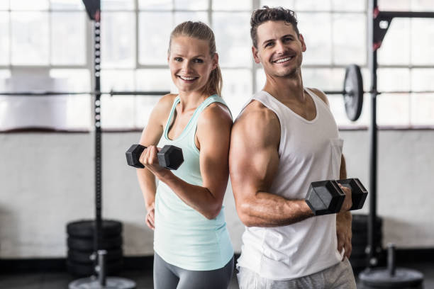 Previous Image Next Image Back to back couple exercising with dumbbells in gym Back to back couple exercising with dumbbells in gym